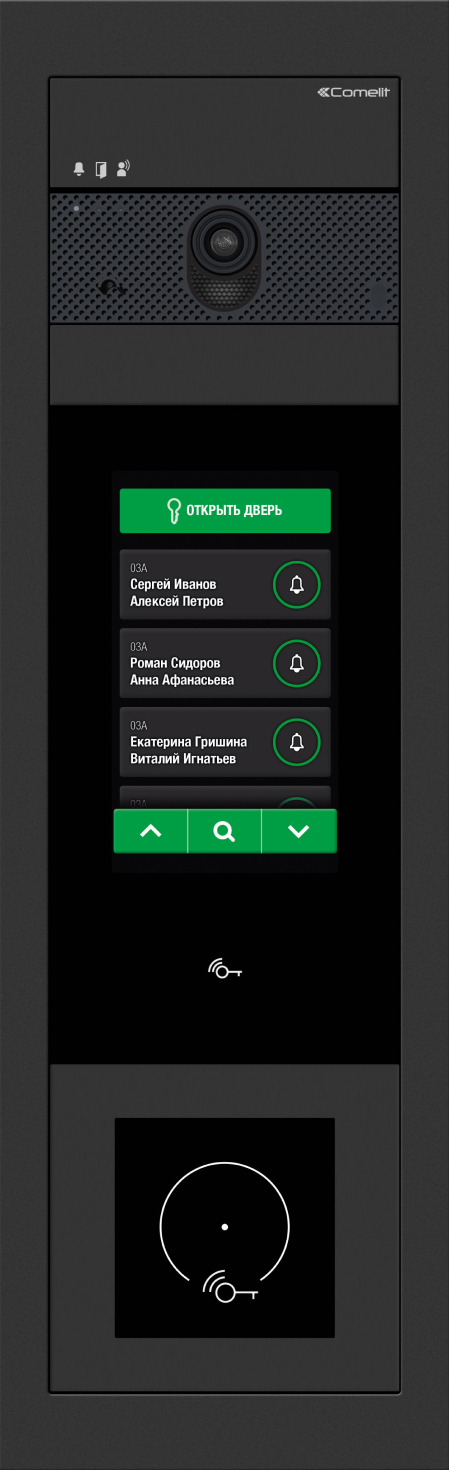 Многоабонентская IP-вызывная Comelit ULTRA. Оснащена камерой с высоким разрешением и углом обзора 130°, функциональной кнопкой прямого вызова абонентов, многофункциональным ЖК-дисплеем и бесконтактным считывателем.
